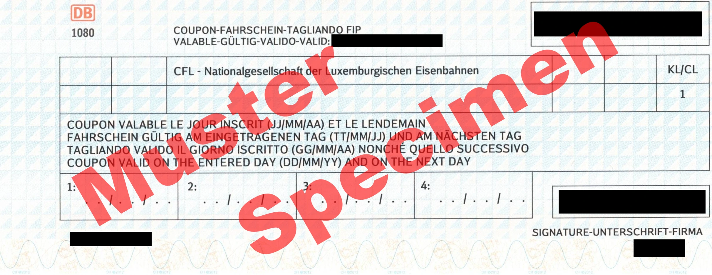 These entitle you to travel on trains operated by the operator specified on the coupon. An FIP Coupon consists of multiple fields. Each field is valid for two consecutive days. The first day of validity must be entered on the ticket. The ticket is then valid on that day and the following day. The different fields themselves do not need to be filled in on consecutive days; the dates only need to fall within the printed validity period. One FIP Coupon per operator can be ordered per calendar year (some railway companies may have different rules for their own employees). This means you can order one FIP Coupon with one to four fields from any number of operators each year. The date on which validity begins determines the calendar year.
