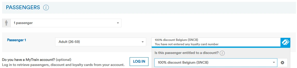 When using a FIP Coupon for SNCB, CFL, or NS, you can book a cross-border ticket on the website that takes the free travel into account for the Belgian, Luxembourgish, or Dutch section. To do this, select one of the following discounts for the travelers: