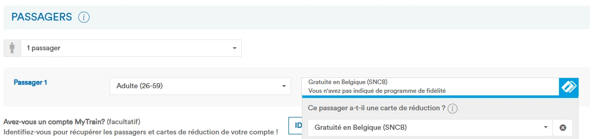 Lors de l’utilisation d’un Coupon FIP pour la SNCB, la CFL ou la NS, il est possible de réserver un billet transfrontalier sur le site web, qui prend en compte la gratuité sur le tronçon belge, luxembourgeois ou néerlandais. Pour cela, il faut sélectionner l’une des réductions suivantes pour les voyageurs :